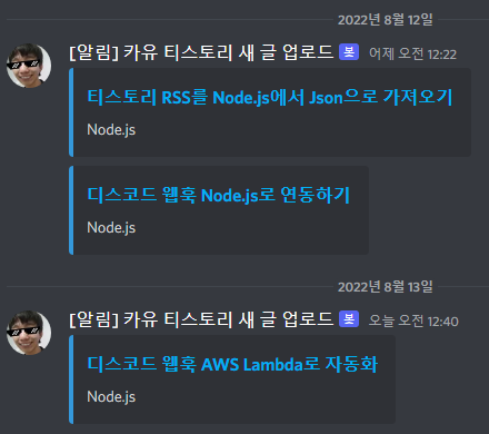 새로 올라온 글인지 확인할 수 있습니다.const axios = require("axios").default; const xml2js = require("xml2js"); const webhookURLs = [ "웹훅 URL" ]; const avatarURL = "프로필 이미지 URL"; /** * 티스토리 RSS 가져오기 * @param {String} rssURL * @returns {{ * title: String, * items: Array.<{ * title: String[], * link: String[], * description: String[], * category: String[], * author: String[], * coments: String[], * pubDate: String[] * }>}} Json */ async function getTistoryRSS(rssURL) { const rssXML = (await axios.get(rssURL)).data; const jsonData = await xml2js.parseStringPromise(rssXML); const rssObject = jsonData.rss.channel[0]; return { "title": rssObject.title[0], "items": rssObject.item }; } let lastPubDate = null; exports.handler = async (event) => { try { // 티스토리 RSS를 Json으로 가져온다. const rss = await getTistoryRSS("https://answn.tistory.com/rss"); // 초기 실행시 마지막으로 쓰인 글의 시간을 저장하고 끝낸다. if (lastPubDate == null) { lastPubDate = new Date(rss.items[0].pubDate[0]); return; } const embeds = []; rss.items.reverse().forEach((item) => { const currentPubDate = new Date(item.pubDate[0]); // 예전에 쓰여진 글이면 아무것도 하지않고 다음 글로 넘어간다. if (lastPubDate >= currentPubDate) return; lastPubDate = currentPubDate; // 새로 쓰여진 글이면 embed 객체로 배열에 넣고 const category = (item.category == undefined) ? "" : item.category[0]; embeds.push({ "title": item.title[0], "url": item.link[0], "description": category, "color": 3447003 }); }); // 배열을 한번에 웹훅으로 보낸다. if (embeds.length > 0) { for await (const webhook of webhookURLs) { await axios.post(webhook, { "embeds": embeds, "username": "[알림] 카유 티스토리 새 글 업로드", "avatar_url": avatarURL }); } } } catch (err) { console.error(err); } const response = { statusCode: 200, body: JSON.stringify('Hello from Lambda!'), }; return response; }